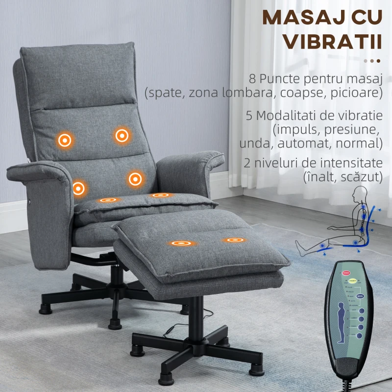 Fotoliu Pivotant si Suport pentru Picioare, Fotoliu de Masaj Tapitat cu Telecomanda, Cronometru si Baza din Otel, Gri