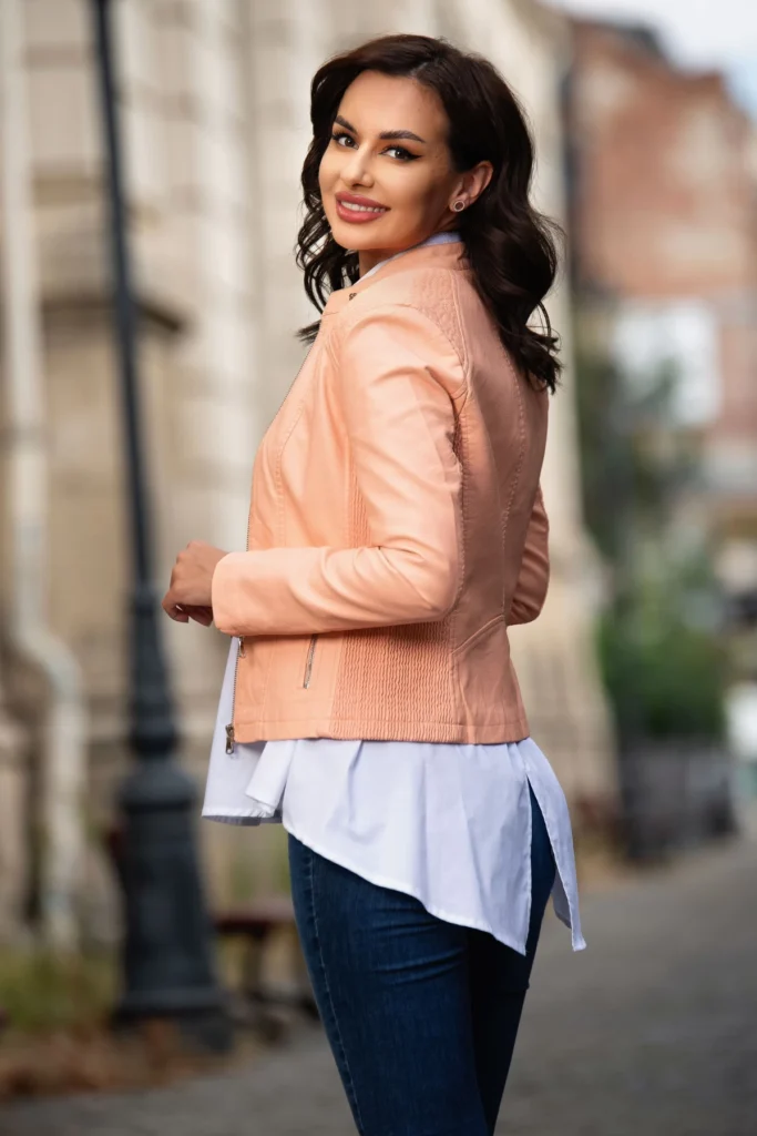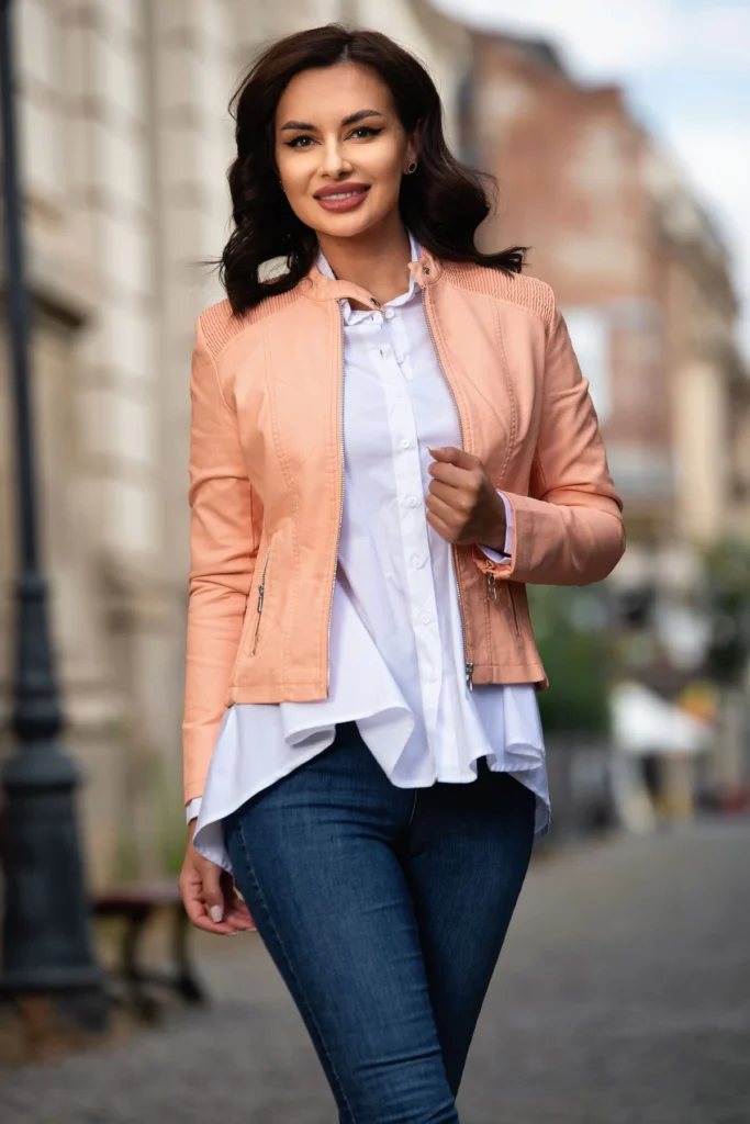 Geaca dama somon din piele eco cu zone plisate